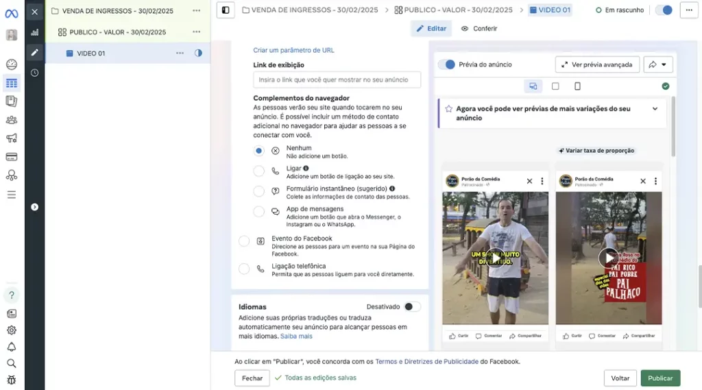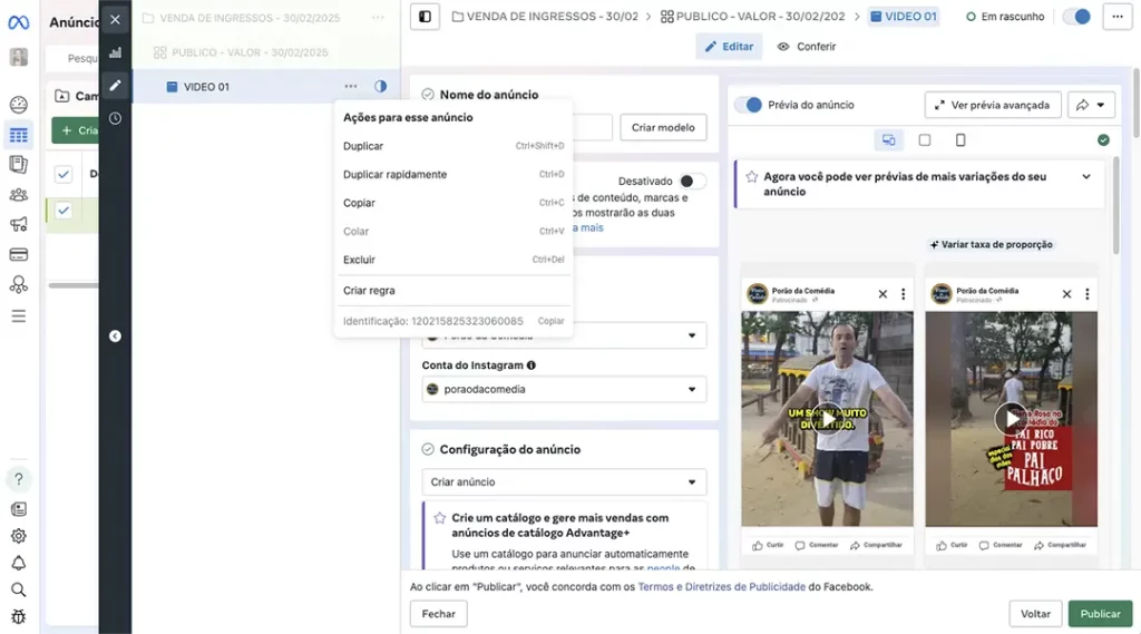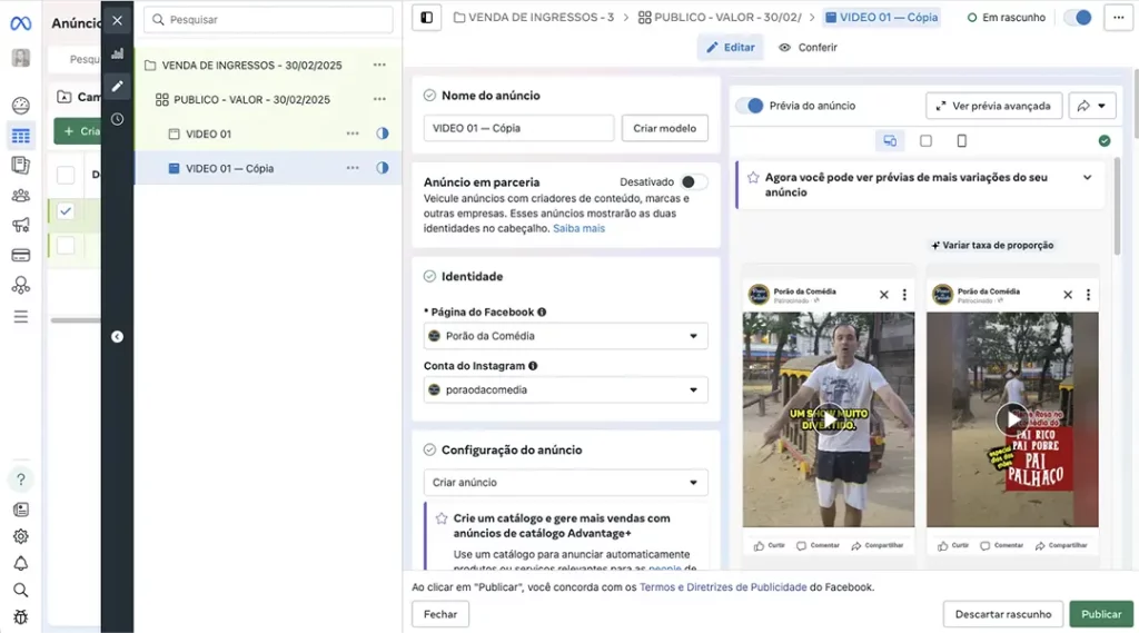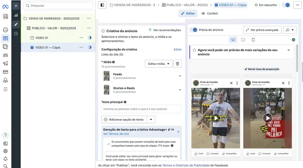 Ao invés de publicar apenas um vídeo para divulgar seu evento, você vai publicar mais 3 vídeos/flyers e deixar que o algoritmo do Meta decida qual vídeo/flyer terá melhor resposta das pessoas, consequentemente aumentando suas chances de venda de ingressos.