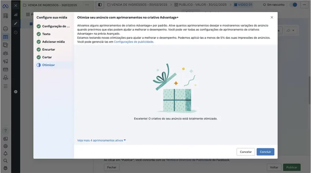 Nessa sessão Otimize seu anúncio com aprimoramentos no criativo Advantage+ clique direto em Concluir.