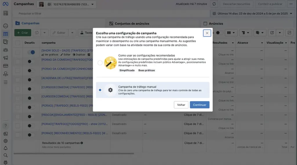 1. Escolha como na imagem: Campanha de tráfego manual – porque? Porque sim!
