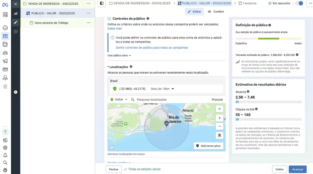 Vale a pena você fuçar nas opções disponíveis para a localização. Você pode colocar o CEP de um lugar. Observe que tem, dentro do mapa, a opção de adicionar pino. Essa é a melhor para você usar. Coloque um pino marcando o local onde será seu evento e ajuste quantos quilômetros de distância você quer que seu divulgação chegue.