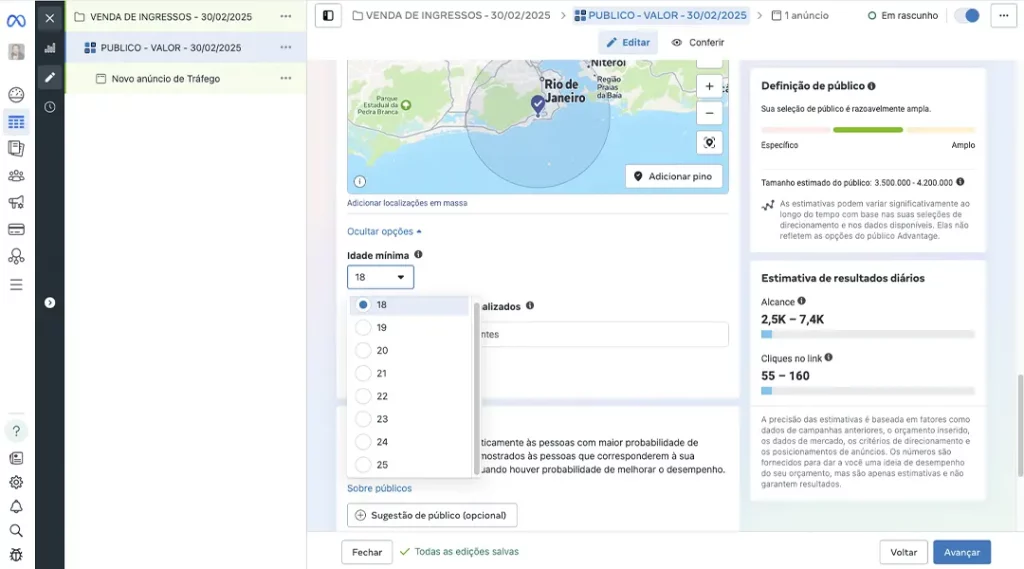 Nesse setor você poderá definir melhor a idade do seu público, o gênero, o direcionar a divulgação para pessoas que tenham interesses, comportamentos e dados demográficos que possam se interessar pelo seu evento.