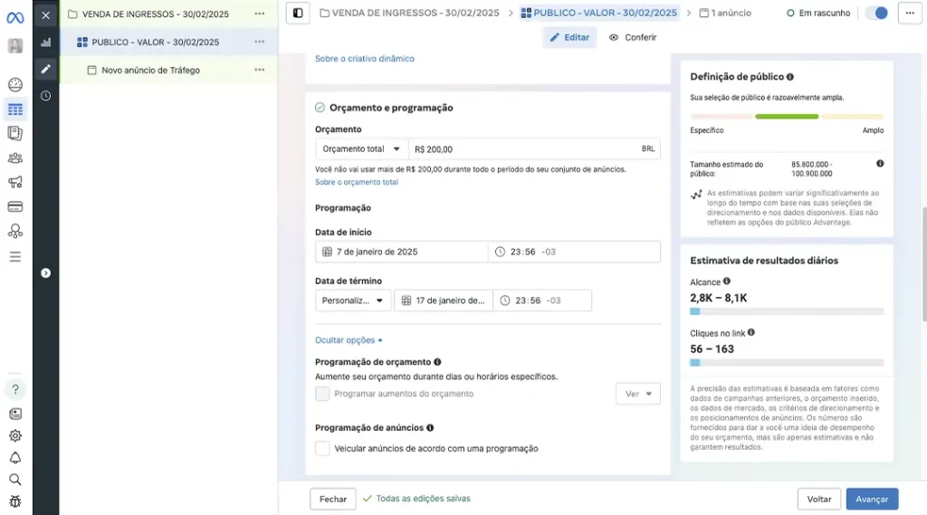 1. Saiba quanto você quer investir na sua divulgação. Para fins didáticos eu vou colocar R$200 para serem usados durante 10 dias. No exemplo da imagem é de 07/01/2025 até 17/01/2025, observe que é possível escolher até o horário que você quer que comece.